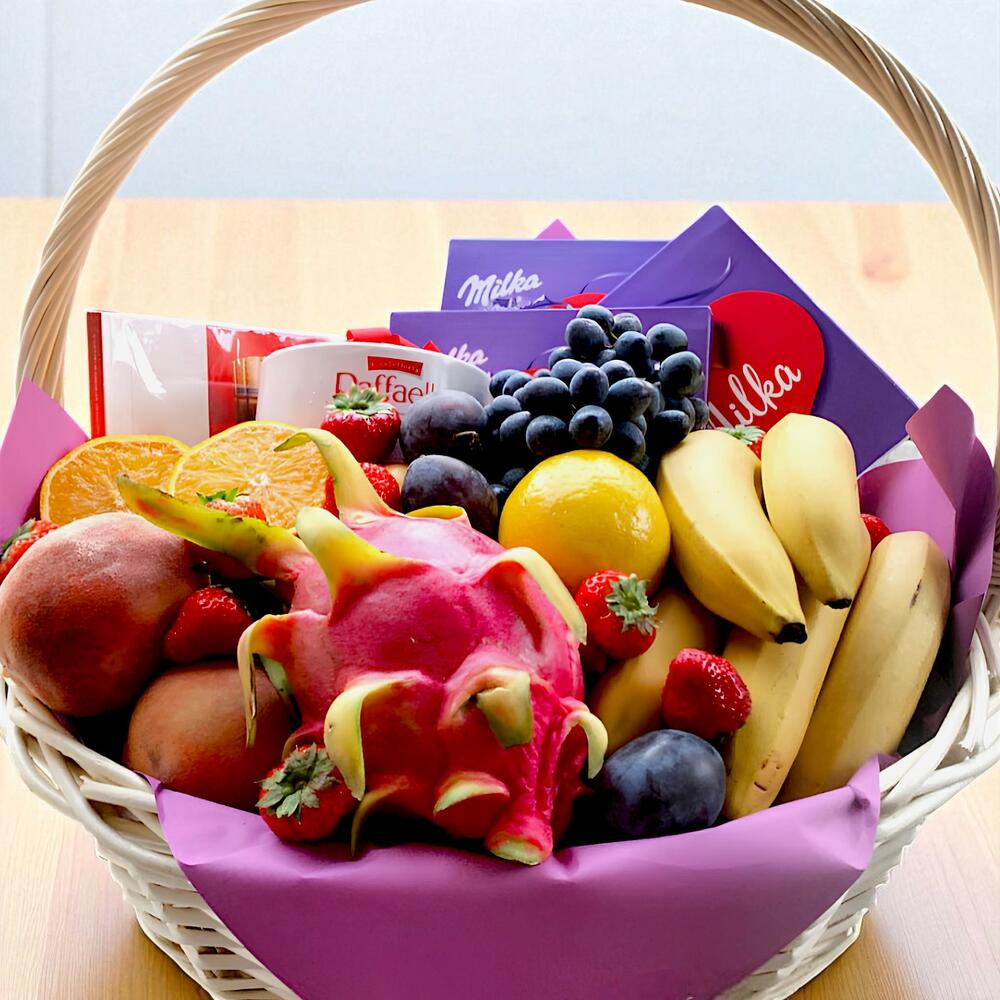 Подарите себе праздник витаминов и вкуса с этим набором свежих фруктов и гастрономических угощений. Включает в себя сочный лимон, сладкие сливы, ароматные яблоки и экзотический драконий фрукт. Также добавлены мягкие бананы и свежайшая клубника, насладитесь виноградом, полным вкуса и жизни. Для особых моментов в комплекте идет плитка нежного шоколада Milka и упаковка изысканных конфет Ferrero. Каждое яблоко, апельсин и клубника тщательно проверены на качество, чтобы вы могли наслаждаться только самыми лучшими фруктами.