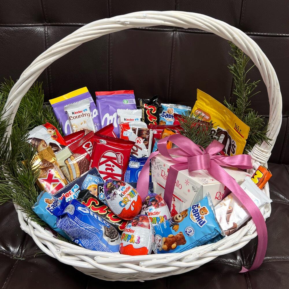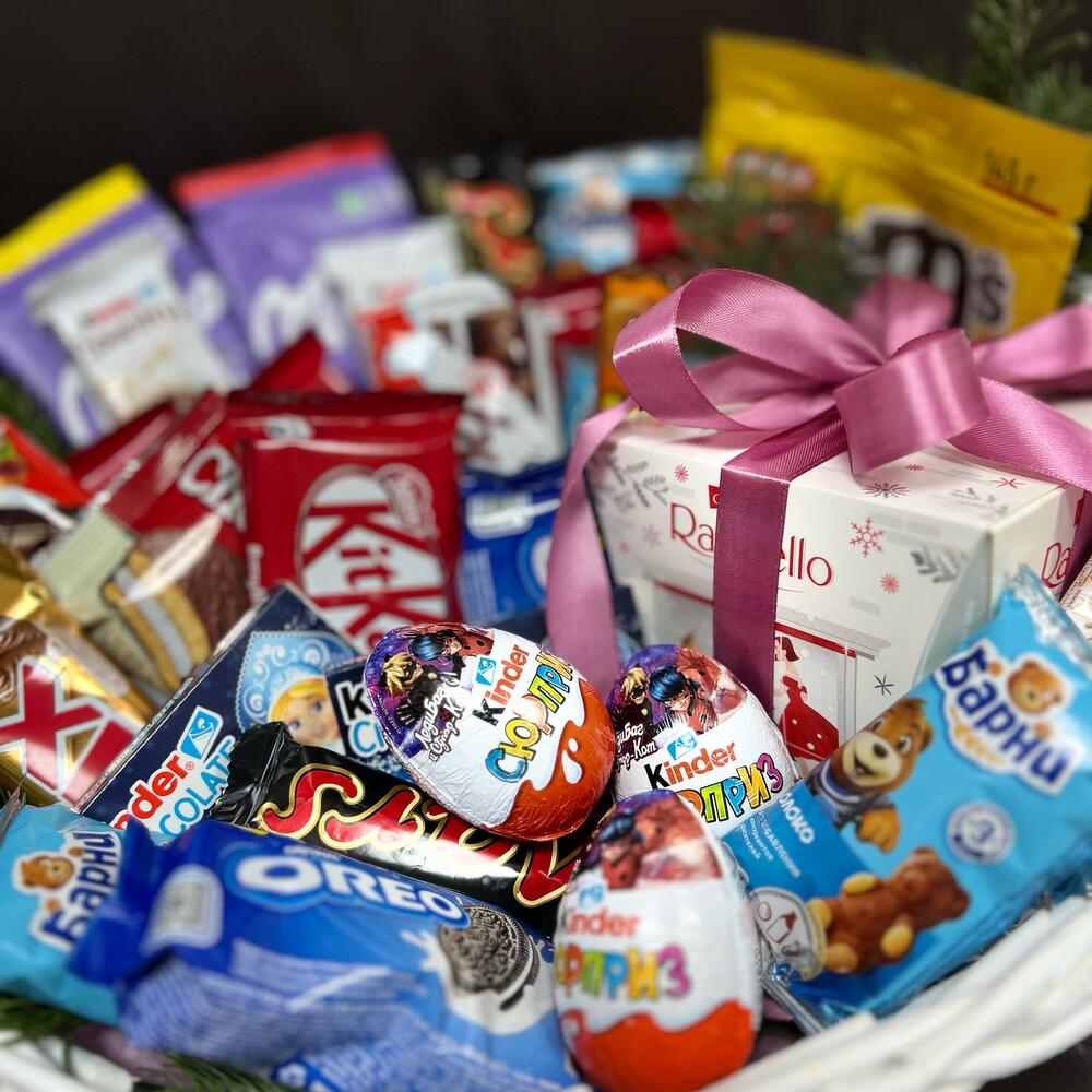 Milky Way - 2 шт. Kitkat - 3 шт. Kinder bueno - 2 шт. Kinder сюрприз - 4 шт. Kinder chocolate - 2 шт. Барни - 3 шт. Raffaello - 1 шт. Twix - 4 шт. Snickers - 2 шт. Milka - 2 шт. mars - 2 шт. choko pie - 3 шт. oreo mini - 2 шт. miller - 1 шт.