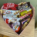 конфеты Merci - 5 шт. Шоколадное яйцо - 1 шт. шоколадный батончик twix - 1 шт. шоколадный батончик nats - 1 шт. вафли kinder bueno - 1 шт. пирожное kinder delice - 1 шт. шоколадный батончик snickers 50.5г - 1 шт. батончик nutella b-ready - 1 шт. драже шоколадное mms - 1 шт. шоколад kinder country 23гр - 1 шт. шоколадный батончик kit kat chunky funky - 1 шт. шоколад молочный фигурный kitkat festive - 1 шт.