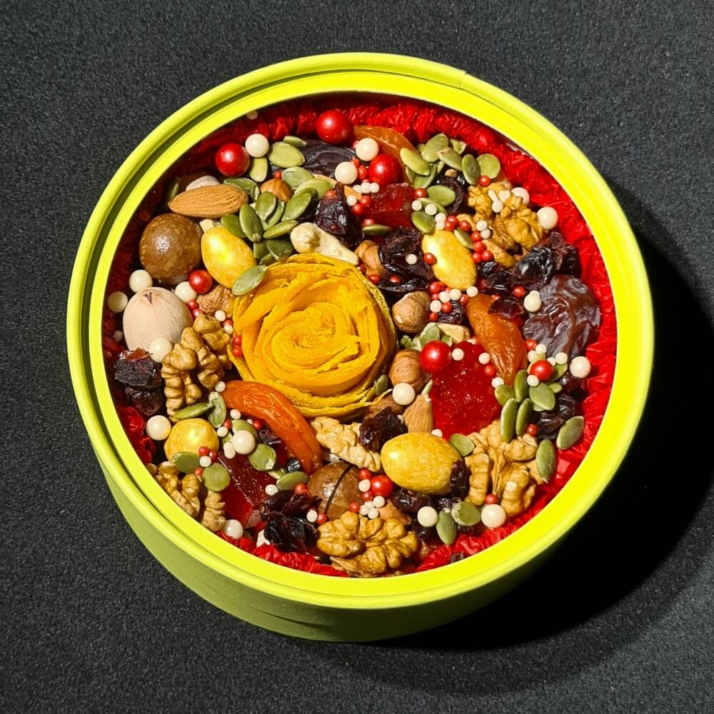 Наполнение свежими сухофруктами, орехами и шоколадными драже .