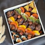 Миндаль - 25 гр. Фундук - 25 гр. груша в темном шоколаде callebaut - 3 шт. курага в молочном шоколаде callebaut - 3 шт. королевские финики в молочном шоколаде callebaut - 7 шт. манго слайсы в белом шоколаде callebaut - 4 шт. чернослив в белом шоколаде callebaut - 3 шт.