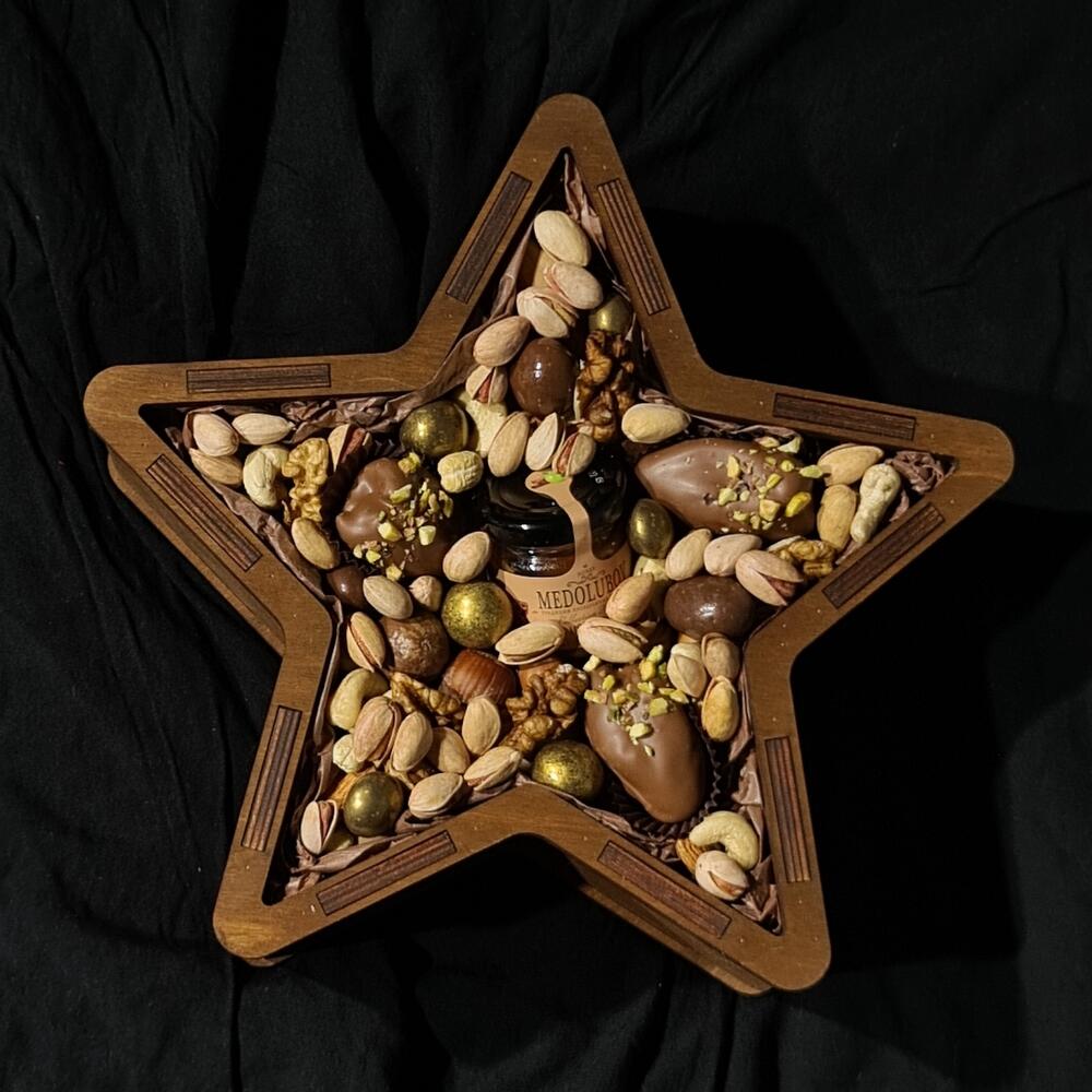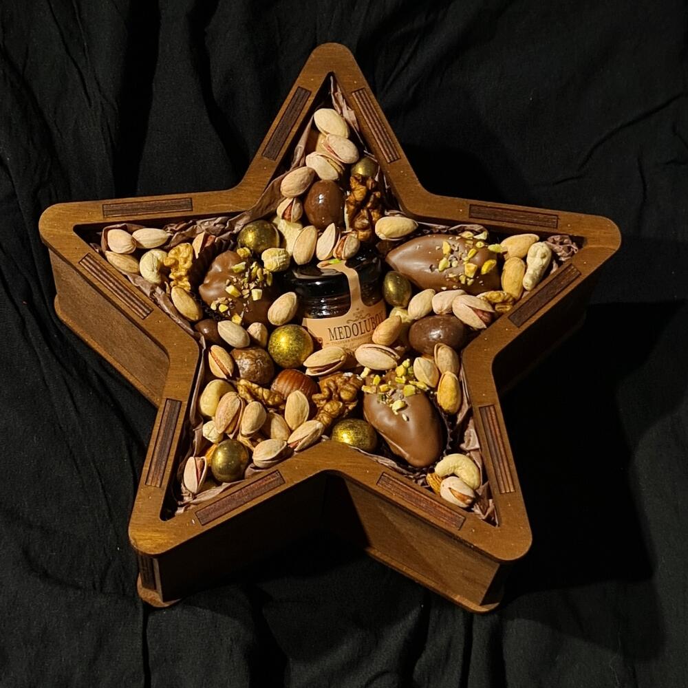 Бокс Звезда- отличный подарок вашему командиру! Полностью заполнен отборными орехами, с добавлением мёда- суфле и королевских фиников в бельгийском шоколаде ⭐️