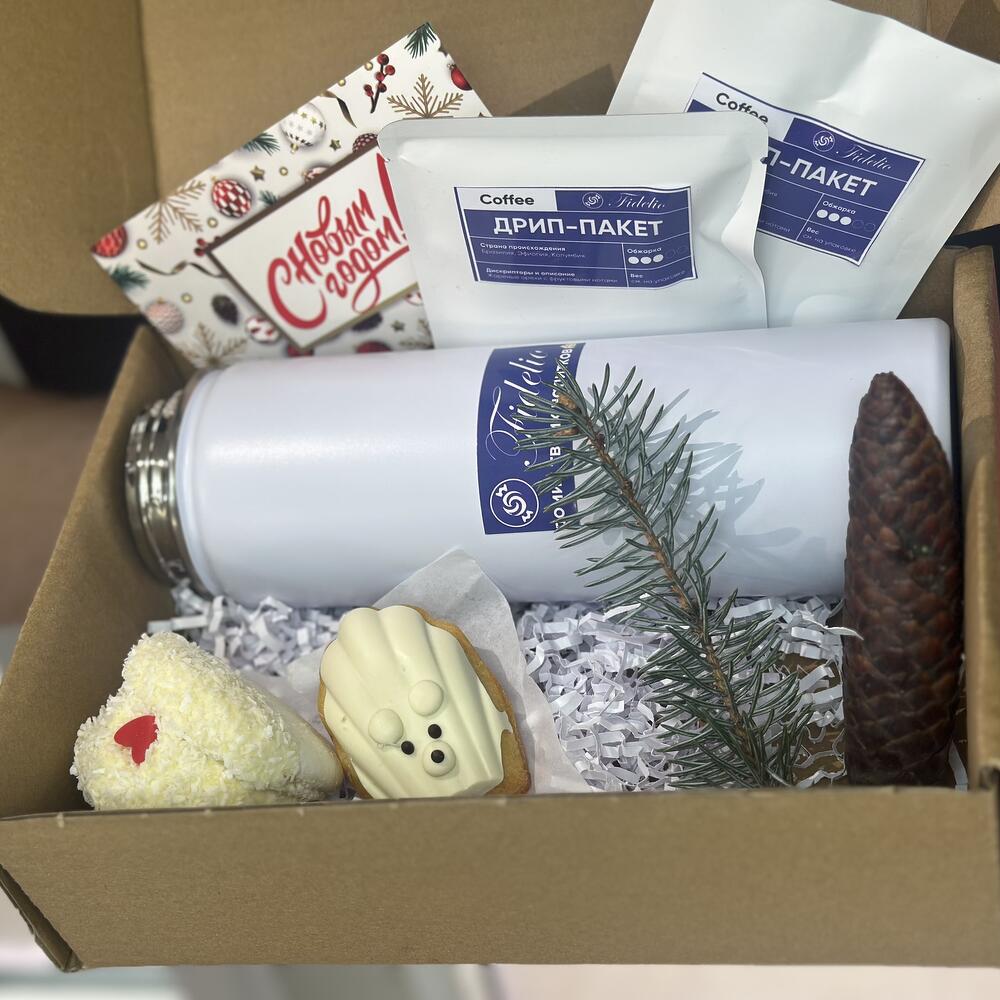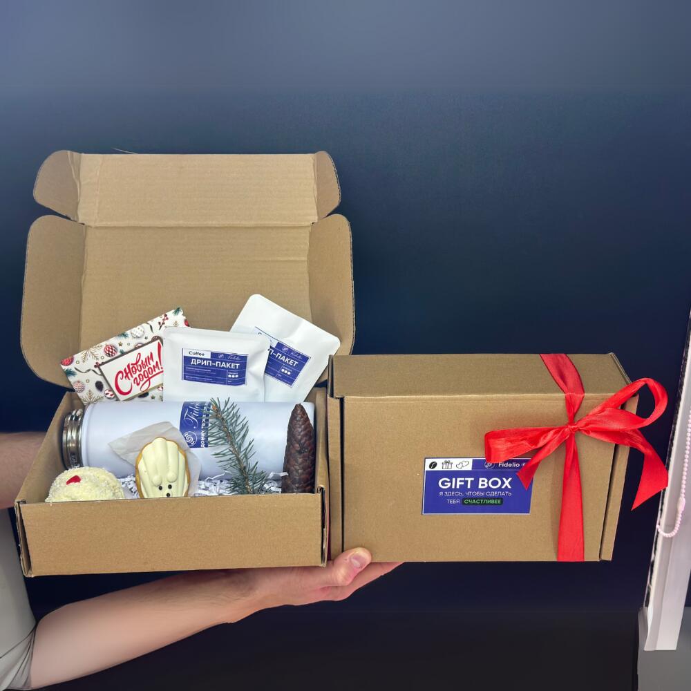 гифт бокс №3 Идеальный подарок для ценителей кофе и сладостей Порадуйте себя или своих близких стильным и практичным гифт-боксом от Fidelio. Этот набор создан для тех, кто ценит уютные моменты и высокое качество: ☕️ Два дрип-пакета с кофе: 100% арабика из Бразилии, Эфиопии или Колумбии, обжаренная нашими мастерами. Легкость в приготовлении и насыщенный вкус — идеальны для дома или путешествий. 🍰 Французский макарон и мадлен: изысканные десерты ручной работы, чтобы сделать паузу еще приятнее. 🔥 Термос со штативом: стильный аксессуар для вашего горячего кофе в любом месте. Это больше, чем просто подарок — это возможность подарить минуты наслаждения и тепла. Спешите заказать, ведь ограниченный тираж делает ваш выбор уникальным!